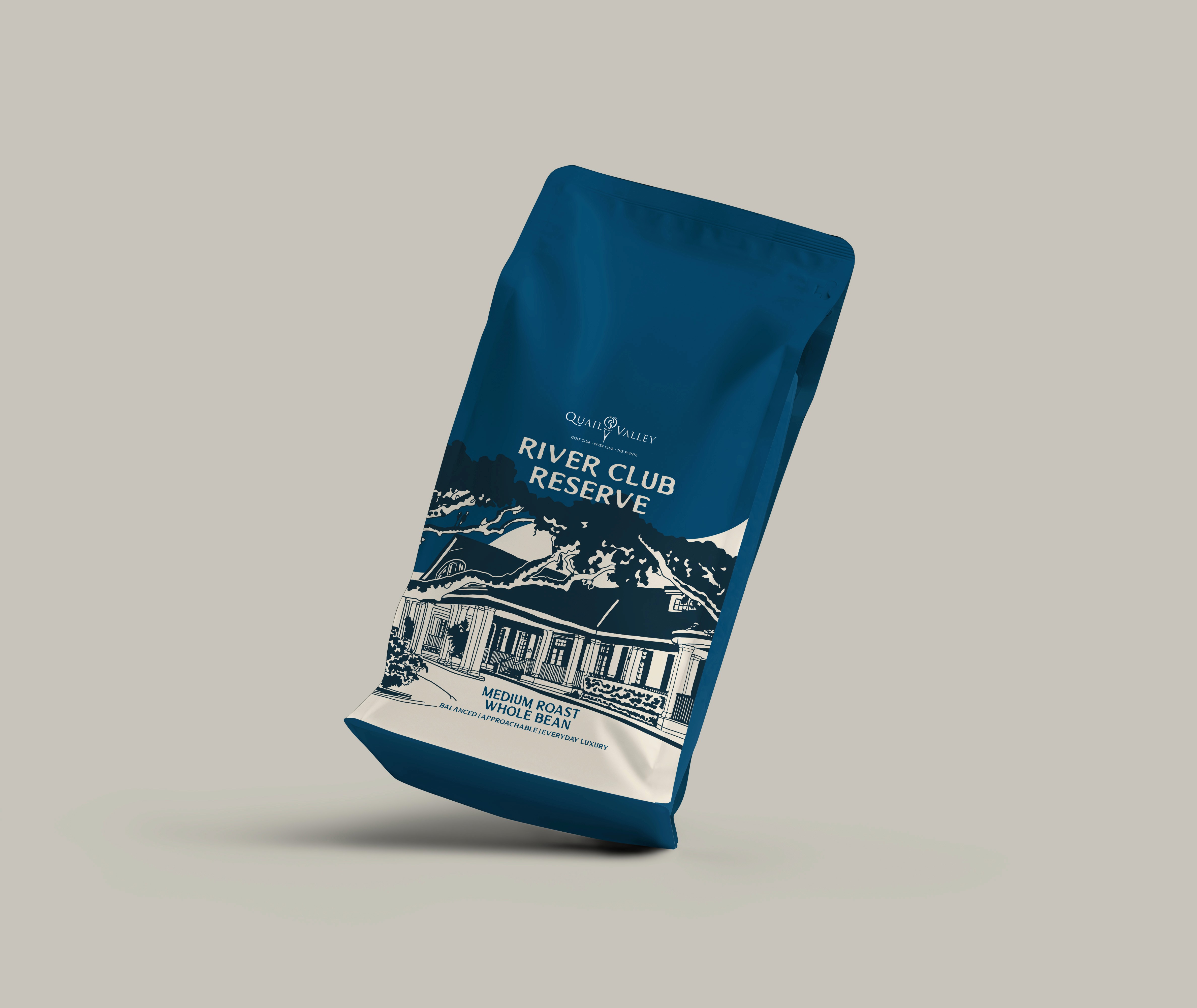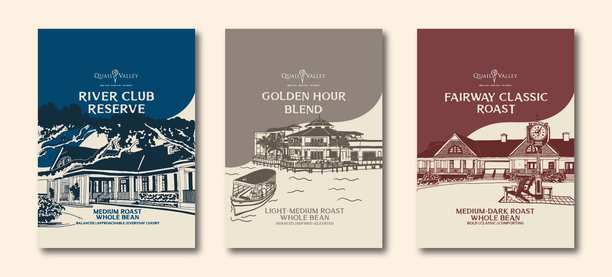 Quail Valley decided to introduce a line of branded coffee sold in their market, but needed a packaging system that reflected the character of their club. The challenge was creating a design that felt classic and premium while clearly distinguishing and representing each of the three locations: The River Club, The Pointe, and The Golf Club.